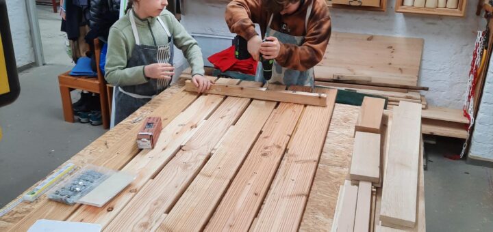 Die Holzwerkstatt arbeitet daran, einen Tisch für den Schulgarten zu bauen. Hier ein Einblick zum Bau der Tischplatte.