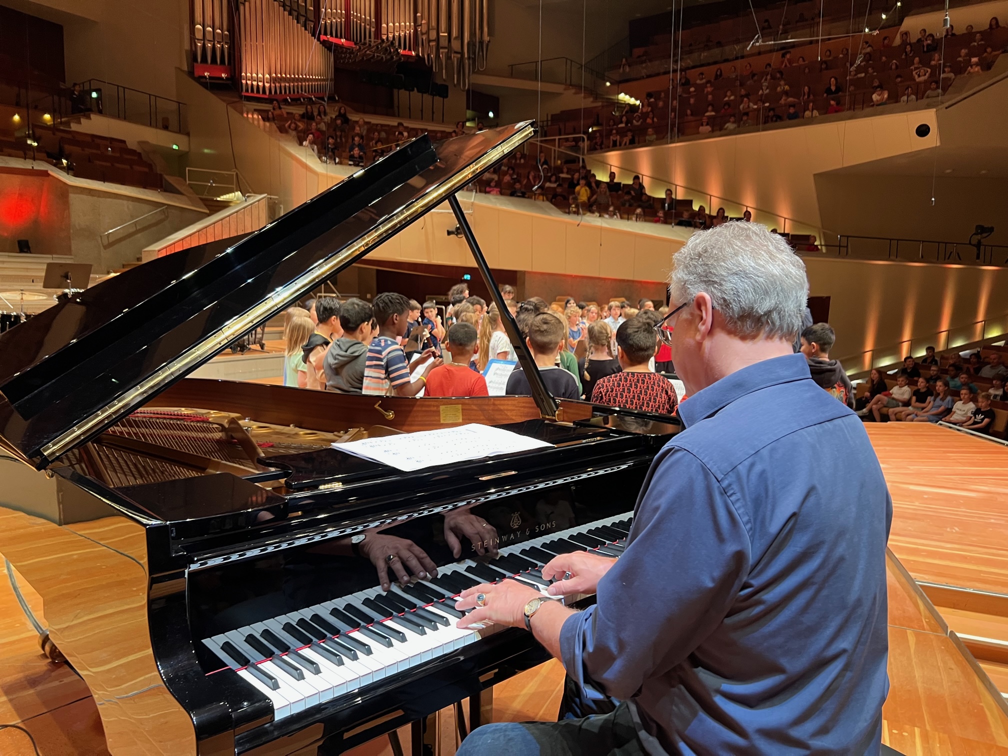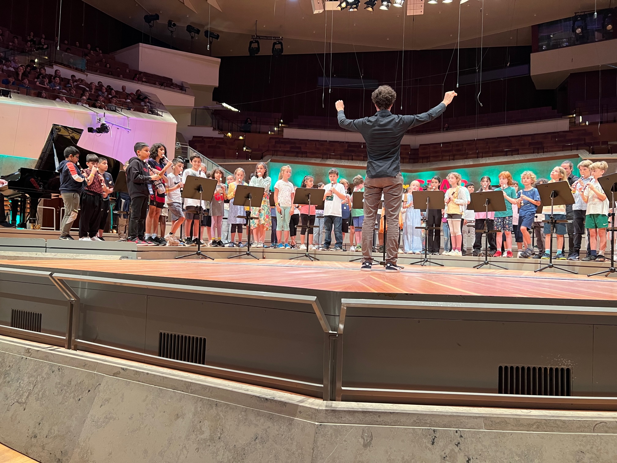 In den letzten beiden Monaten haben alle achtzig Flötenkinder aus den vier dritten Klassen fleißig geübt, um drei mehrstimmige Musikstücke im Großen Saal der Berliner Philharmonie zu musizieren. Alle Kinder und die Flötenlehrer hatten nur ein Ziel vor Augen, dann endlich war es soweit: