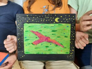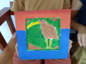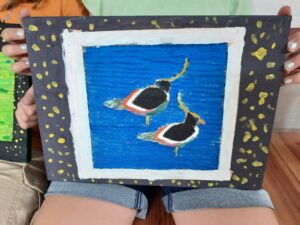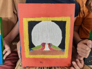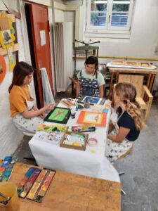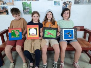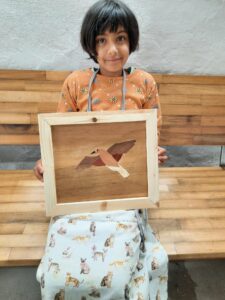 Werke aus dem Bildhaukurs und Furnierbildworkshop