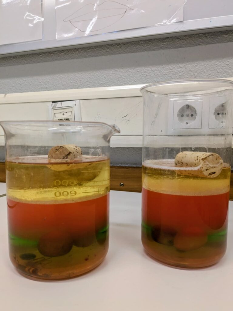 In den 5. Klassen wurde zum Thema Dichte geforscht. Zuerst wurden verschiedene Flüssigkeiten zu einem Dichteturm gestapelt und Gegenstände in ihnen versenkt. Wo bleiben sie stecken und warum?