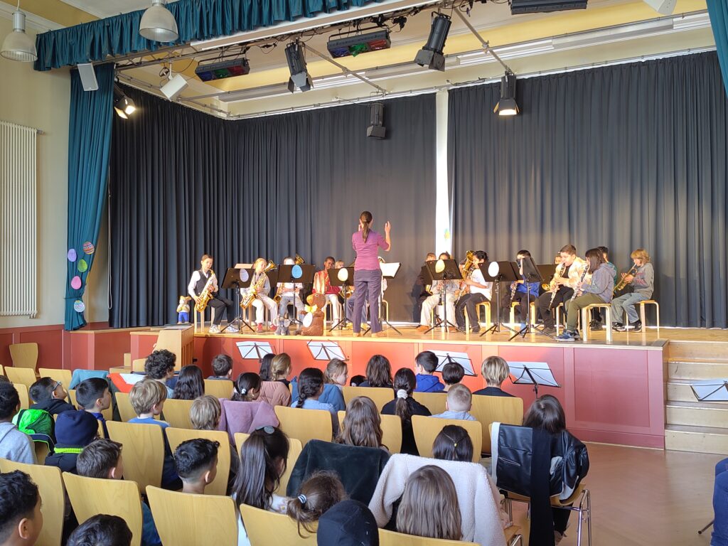 Nach wochenlangem Proben hatte die große Bläserklasse beim Frühlingskonzert einen tollen Auftritt. Trotz anfänglicher Aufregung haben sie nicht nur einen, sondern zwei souveräne Auftritte an einem Tag gespielt!